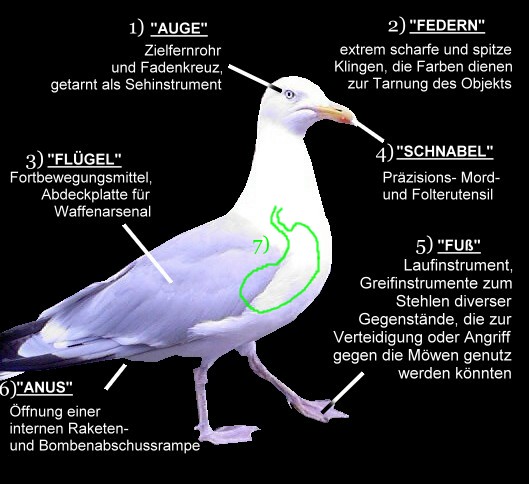 zu 6) Der Anus des Möwe dient sowohl zum Ausscheiden von Fäkalien, als auch als Abschussrampe für Zielsuchende Raketen und für Bomben. Diese sind ebenfalls als Fäkalien getarnt. Auch wenn diese Bomben und Raketen immense Zerstörungskraft haben, treffen diese eher selten. Selbst die zielsuchenden Raketen treffen nur in 1% der Fälle.